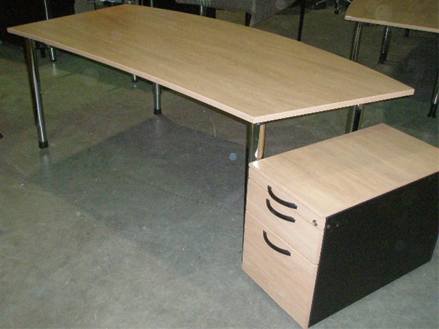 Bureautafel OKA, gebogen blad: peren, hoogte instelbare ronde poten: verchroomd, incl. kabelgoot