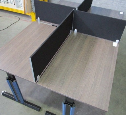Callcenter werkplek vzv.. NIEUW blad 120x80cm.: Chateau eiken, T-poot onderstel: zwart met blauw accent, incl. NIEUWE opzet tussenwand met 2 bladklemmen in alu, stofkleur: zwart