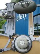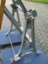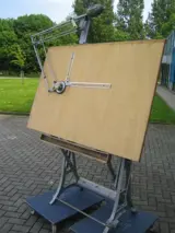 Antieke tekentafel Nestler, vzv. tekenmachine met contragewicht, gietijzeren pootstel Libra, hoogte instelbaar houten blad met aflegbak