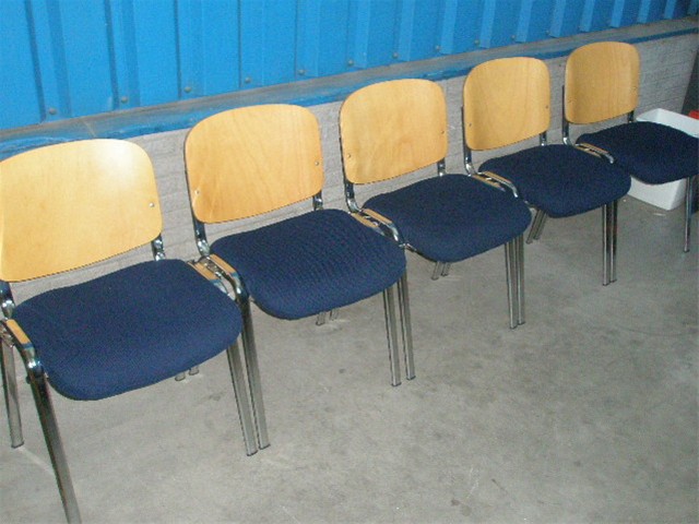 SET van 5 stoelen, 4-poots verchroomd frame, stapelbaar, rugkleur: beukenhout, zitting: stof donkerblauw, inclusief koppeling, totale breedte indien gekoppeld, B277cm.,
