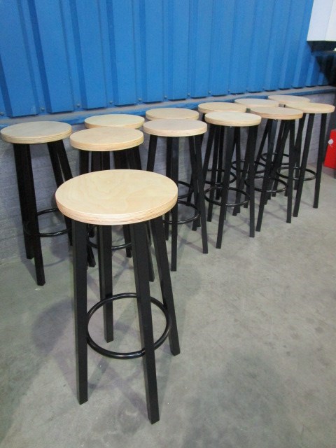 SET van 6 stuks nieuwe barkrukken, 4-poot metalen frame incl. voetenring: zwart, blank houten kop Ø32cm.