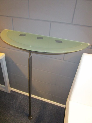 Halfronde tafel B97xD38xH109cm. met glazen blad motief, enkele poot t.b.v. bevestiging aan de grond: zwart