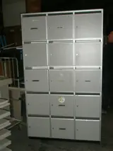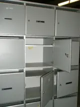 Lockerkast 15- deurs afm. H209xB130xD40cm., ieder vak is voorzien van een sleuf voor post en 1 sleutel, kleur ombouw en interieur: aluminium, houten sokkel: zwart, binnenafmeting per vak: H26xB38xD39,5cm., zeer degelijke kwaliteit