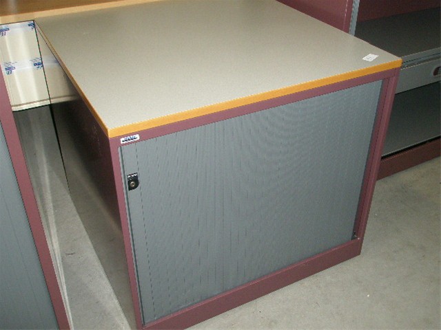 Roldeurkast Ahrend, ombouw: donker rood, lamellen: grijs,