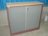 Roldeurkast Ahrend, ombouw: donkerrood, interieur en kunststof lamellen: grijs, topblad: lichtgrijs of houtprint, met 2 legborden of uittrekframes voor hangmappen, zonder sleutel