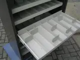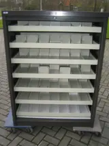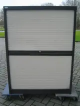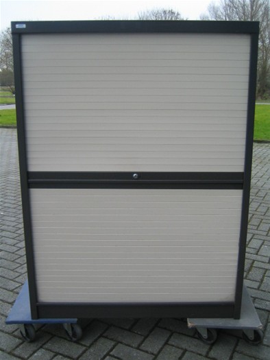 kleur metalen ombouw: donkerbruin, kleur interieur en kunststof lamellen: beige, zonder sleutel, horizontale roldeuren en 6 uittrekbare lades met lade verdeling, plaatsing op begane grond i.v.m. zware gewicht