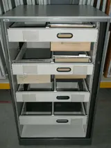 Kast Ahrend met 4 uittrekbare frames geschikt voor 2 rijen A4 hangmappen, ombouw en kunststof lamellen: antraciet, topblad: lichtgrijs, zonder sleutel