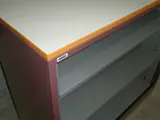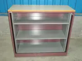 Open kast afm. H110xB120xD45cm., ombouw: donkerrood, interieur: grijs, met 2 legborden en topblad: lichtgrijs