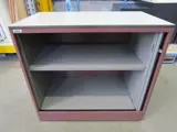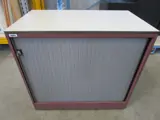 Roldeurkast Ahrend afm. H75xB80xD45cm., ombouw: donkerrood, volkern topblad: grijs, kunststof lamellen: antraciet, met 1x legbord (1 laag ordners totaal in kast), 1 sleutel, stelpootjes