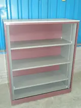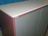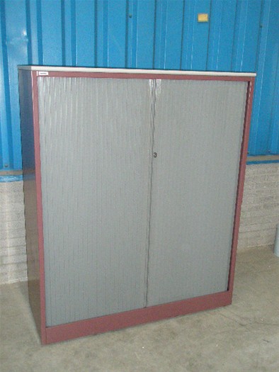 Roldeurkast afm. H145xB120xD45cm., ombouw: donkerrood, kunststof lamellen en interieur: grijs, met 3 legborden, topblad: lichtgrijs