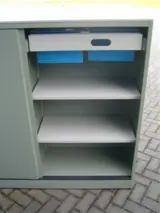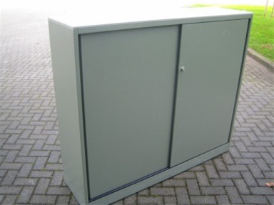 Schuifdeurkast met links 3 en rechts 2 legborden, 1 uittrekbaar frame tbv. A4 hangmappen, zonder sleutel, ombouw: groen, legborden: beige