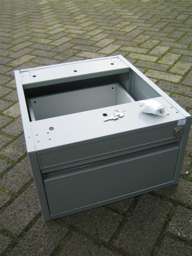 1- Ladeblok, zonder topblad, ombouw en lade: antraciet, interieur: l.grijs, vzv. 1 lage lade A-6, tbv. montage onder bureau of in werkauto, vzv. 2 sleutels