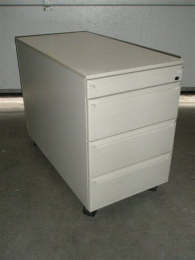 Verrijdbaar 3- ladeblok, kunststof ombouw en front: beige, kunststof interieur: donkerbruin, vzv. 3x lage laden A6 met ladeverdelers, 1x pennenlade, 1 sleutel