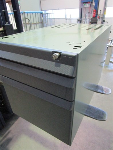 2- ladeblok Ahrend, zonder topblad, ombouw metaal: groen, kunststof fronten: antraciet, zonder sleutel, vzv. 1x lage lade A6, 1x hangmappenlade, 1x pennenlade, niet verrijdbaar