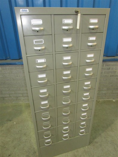 30-Ladekast Gipsen Vintage uit de jaren '60, grijs, handvatten: aluminium, binnenmaat laden: H9xB13,5xD38cm., elke lade vzv. uitneembare ladeverdeler op geleider, alle laden lopen goed, zonder sleutel