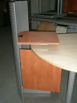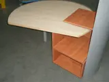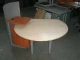 1x werktafel rond Ø120cm., blad: wilde peren, 2-poot rond onderstel: aluminium en 1x computertafel, blad: peren, geperforeerde scheidingswand: aluminium, incl. kabeldoorvoerdop en uitschuifbaar blad