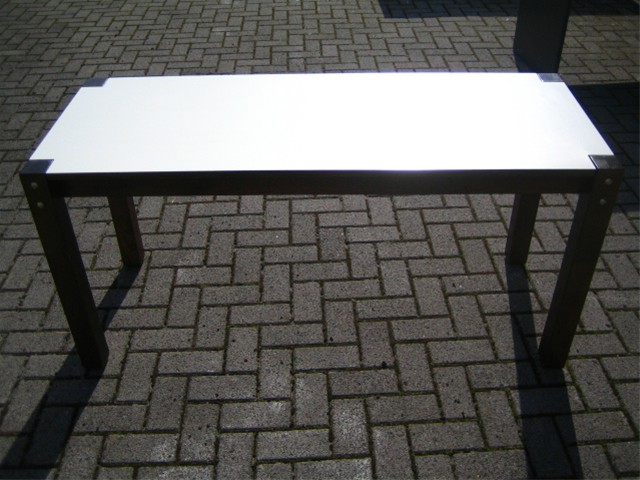 Tafel vzv. multiplex blad: beige, 4-poot houten frame: donkerbruin