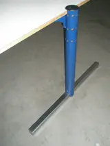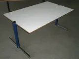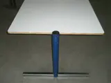 merk: Gispen ST, multiplex blad 18mm.: lichtgrijs (beschadigd), T-poot frame: blauw met verchroomde voet, vzv. stelpootjes en kabeldoorvoer door pootstel