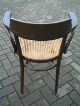 SET van 7 stuks Thonet stoelen, type 233, houtmotief zitting: l.bruin, gelakt houten frame: d.bruin, 4-pootsmodel vzv armleggers,