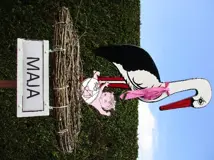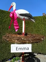 De laatste trends, indien gewenst: als de baby nog niet geboren is kan het ooievaarsnest op paal met bordje landingsplaats een of twee weken voor de geboorte van de baby geplaatst worden.
