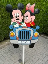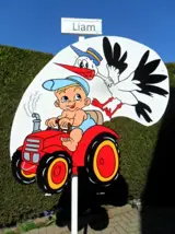Te huur geboortebord { bijvoorbeeld beertje op wolk } naar keuze of ooievaar met en zonder nest in diverse uitvoeringen, huurprijs 5 euro per week bij 6 weken huren + gratis naam bordje en grondpaal.
