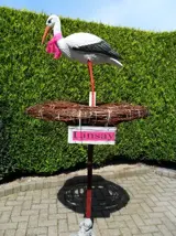 Te huur 3d ooievaar hoogmodel of laagmodel op echt nest van takken, keuze uit zeer uitgebreide collectie met of zonder kleine ooievaartjes op echt 3d nest van takken op paal laagste huurprijs van NEDERLAND geweldige keuze voor maar 5 euro per week bij 6 weken huren met gratis naambordje van uw baby en gratis bordje landingsplaats voor de ooievaar en gratis roze of blauwe strik.