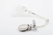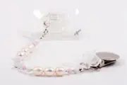 Echt zilver, Swarovski kristallen, echte zoetwaterpareltjes en de speenkoorden hebben ook nog eens een schattig strikje.