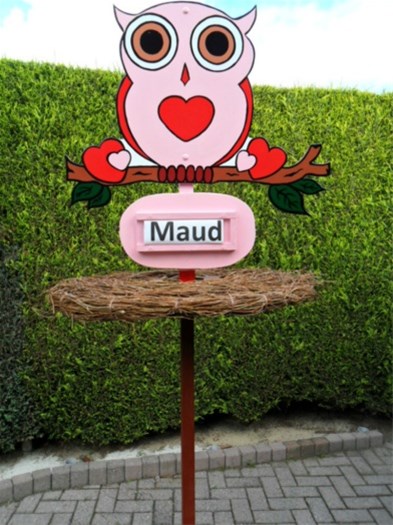 - Nieuw geboortebord uil uiltje op paal of nest met paal.