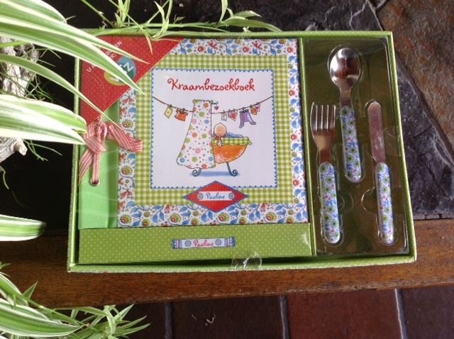 Pauline oud - kraambezoek boek ,inclusief bestek, nieuw in doos - aan de hand van leuke vragen kun je het bezoek een plaatsje in dit boek geven - plaats voor fotos en notities. - Een prachtig cadeau vol dierbare herinneringen voor nu en later! - 11,50
