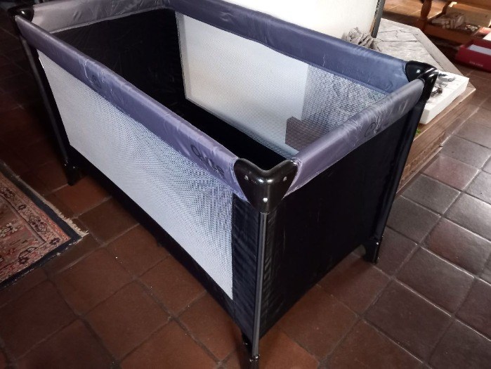 - bijbehorende campingbed campingbedmatras van het merk Qute in ventilerend 3D mesh materiaal, kleur zwart.