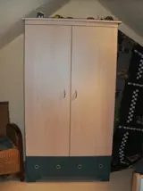 Bestaat uit een ledikantje ( zonder matras) Commode en grote hang lig kast.