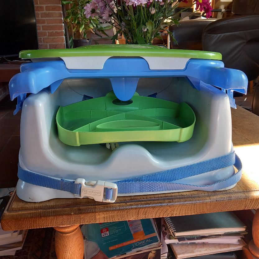 Fisher price kinderstoeltje / stoelverhoger - stoel wordt op een eenvoudige manier op grote stoel geplaatst - stoel is verstelbaar - zeer degelijke uitvoer - kindje wordt met tuigje vastgezet - stoel heeft en afneembaar blad, speelblad - een extra blad , waar een beker / fles inpast - ideaal voor onderweg, op vakantie, bij het op visite gaan - i,p,st, 15,-