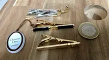 2) dasspeld in klassiek zwart en goud met het originele label. Mooie stijlvolle dasspeld in zeer goede staat. 50mm