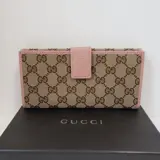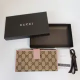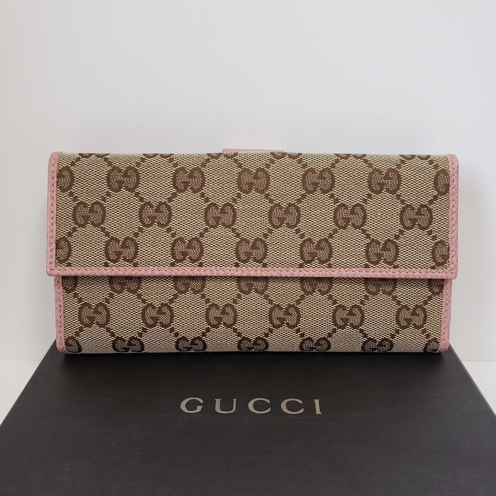 Lange Gucci-portemonnee van canvas met monogram en roze lederen bekleding. De drukknopen openen naar een bijpassende roze leren voering met 7 creditcardsleuven, 4 open zakken voor billfold en een muntzakje aan de achterkant.