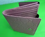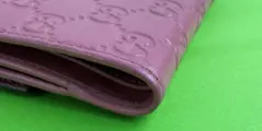 Het is kleur Donker roze. Gemaakt in Italië. Materiaal: donkerroze unisex leer met 2 geldvakken (1 geldvak, 1 memovak), 1 muntvak achter de portemonnee. 5+5 kaartvak. Kliksluiting. rits geen. Hoek & Randen: Geen krassen. Sluiting: Flap Button wordt geleverd met geen.