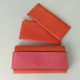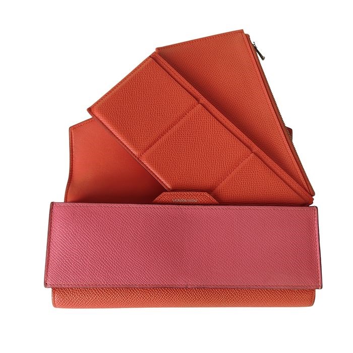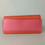 Tweekleurig oranje en roze, met staalkleurige hardware.