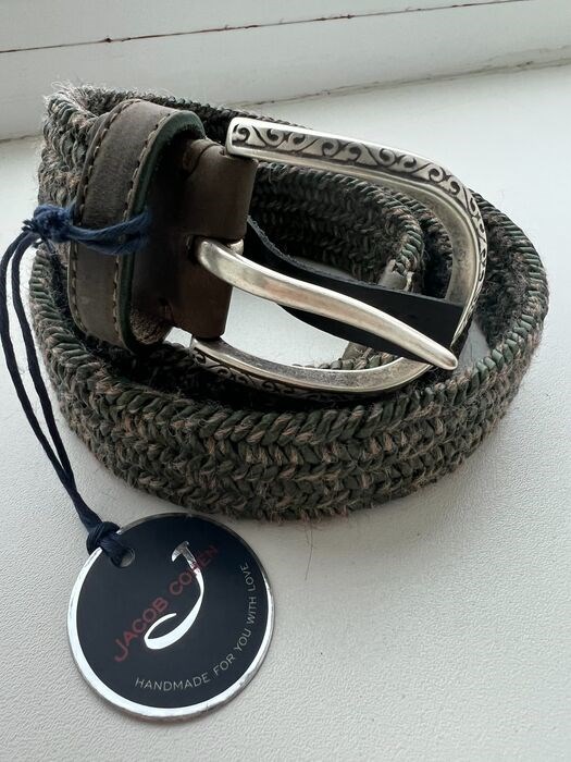Originele en 100% authentieke Jacob Cohen fashion herenriem in kaki en bruine kleur. Luxe Jacob Cohen-riem is handgemaakt in Italië. Unieke gevlochten ( geweven ) Jacob Cohen riem gemaakt van gemengde stof en echt leer .