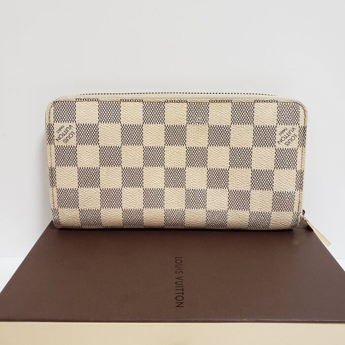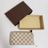 Deze damier Azur portemonnee is in gebruikte staat. De carrosserie is nog zeer stevig en voelt goed aan. Het exterieur Damier Azur canvas ziet er nog goed uit. De randen en hoeken hebben lichte slijtage en het witte doek langs de randen is vuil geworden. Zie foto's. Alle binnenzakken en compartimenten vertonen lichte sporen van eerder gebruik, maar over het algemeen nog vrij schoon en rits loopt soepel. Zie foto's voor meer details. De goudkleurige hardware vertoont aanslag. Dit artikel wordt geleverd met een doos.