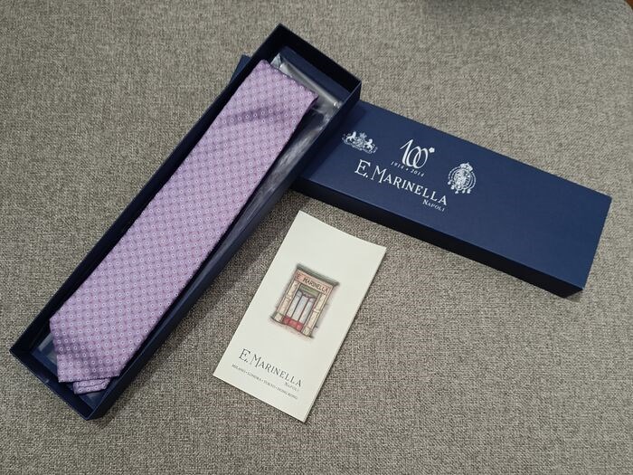 Nieuwe stropdas, nog geseald in de verpakking, van de bekende fabrikant Marinella di Napoli; het maakt deel uit van de 100-jarig jubileumcollectie van de fabrikant (te lezen op de verpakking).