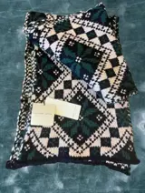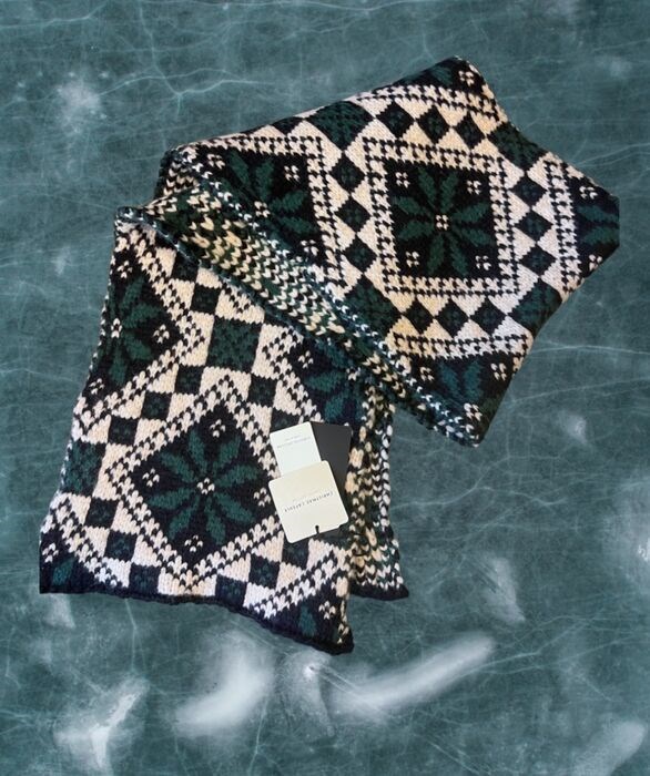 Ecru, navy blue and green scarf in a jacquard knitted alpaca-wool mix. It features a wintery pattern and ribbed edges.