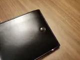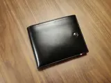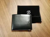 ST DUPONT PARIS - 8CC Bifold lederen portemonnee, onderdeel van de Line D-collectie, gemaakt van glad zwart kalfsleer met kenmerkend metallic logo aan de voorkant. Interieur in glad zwart leer en zachtblauwe voering met acht kaartsleuven, vier zijsleuven en een compartiment met een scheidingswand voor bankbiljetten.