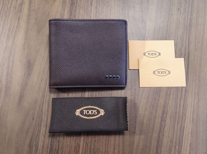 TOD'S - 8CC tweevoudige leren portemonnee gemaakt in Italië van gestructureerd bruin kalfsleer met metallic logodetail aan de voorkant. Binnenkant van generfd kalfsleer met zachte leren voering, acht kaartsleuven, twee zijsleuven en een centraal compartiment met een scheidingswand voor bankbiljetten.