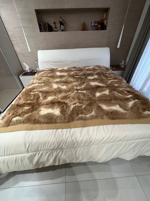 Prachtige deken in zeer grote naturel kleur Guanaco bont, beige binnenzijde en een elegante vicuna wollen stof, ondanks dat hij (licht) gebruikt is in uitstekende staat.