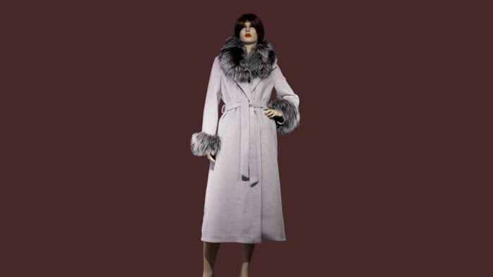 Mooie grijze cashmere/wollen jas met frost fox garnituren