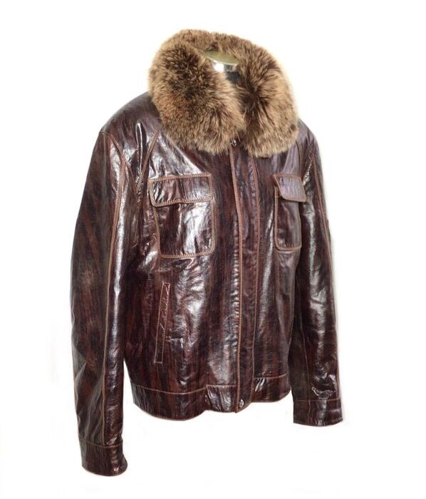 Jas van nerfleer, licht lakleer in zeer goede staat. Geen beschadigingen of vlekken. De voering is gemaakt van geschoren schapenvacht. De jas vertoont lichte gebruikssporen. De jas heeft vier buitenzakken plus een zak op de mouw.