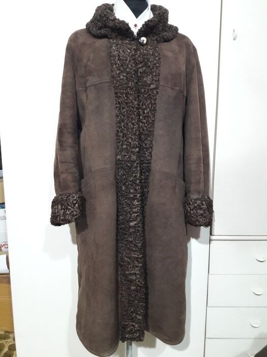 Mooie originele Sherling schapenvacht volgens het label in bruin lamssuède gesigneerd "Fibok", van binnen voorzien van een zachte bruine kortharige vacht. Sluit met 1 knoop en 3 haken voor 2 buitenzakken.
