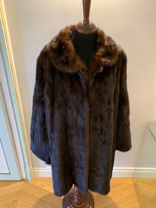 Donkerbruine nertsjas met sjaalkraag en knoopsluiting aan de voorzijde.