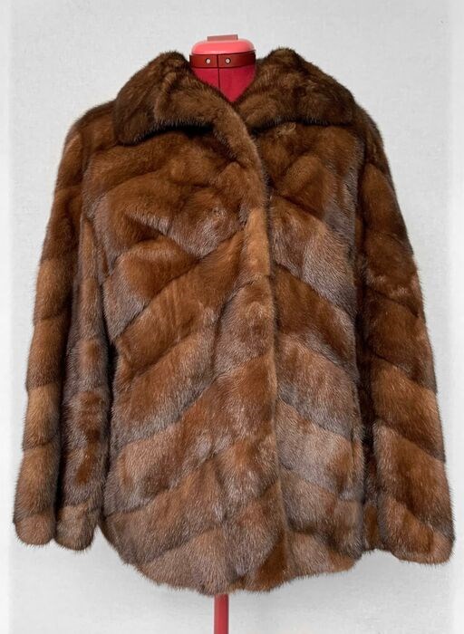 Prachtige bruine nerts bontjas gemaakt uit diagonale repen nertsbont