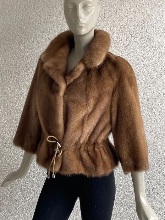 Magisch nerts jasje in nette staat, zijdezacht bont, jeugdig model, 3/4 mouwen, trekkoord in de taille,