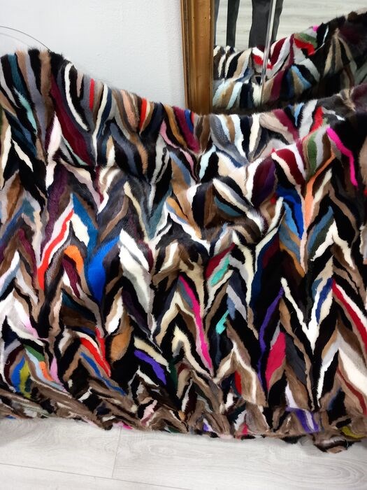 Gloednieuw veelkleurig nertsenlaken geschikt als tapijt, deken, siervoorwerp, om bontkleding of voorwerpen van te maken. Inleg werk. Bijgehouden verzending via UPS